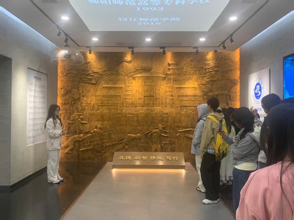 活动期间,三位讲解员有序引导新生穿梭于序厅及各核心展区。在序厅,新生们通过前言与《学校迁建记》初步感知学校“从筚路蓝缕到薪火相传”的初心,沙金浮雕里“肩挑背扛搬运物资”的场景与“立德、启智、修能、笃行”的校训交相辉映,让大家对学校精神有了直观认知。步入“校史篇”展区时,1906年郧阳府师范学堂毕业证照官方授权复制品格外引人注目——作为馆内“镇馆之宝”,它以湖北省档案馆特藏原件为母本制作,还被列入“湖北百馆珍品档案”,讲解员向新生介绍其罕见的尺寸与承载的历史价值,让大家从百年前学子的课程成绩与品行记录中,真切体会到学校“育人为本”的师范初心。