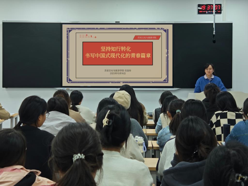 开班仪式结束后,任书记为本次培训讲授了第一讲。她以“坚持知行转化,书写中国式现代化的青春篇章”为主题,从中国传统的知行合一思想、习近平的知行观、当代大学生的知行观培养、新时代知与行的思想指引和行动指南四个方面进行了深入讲解。课程中任书记结合今年纪念抗日战争胜利暨世界反法西斯战争胜利80周年纪念活动,多次与同学们进行交流互动,引导大家以史明志,深刻理解国家独立和民族尊严的艰辛历史,树立文化自信,强化使命担当,勇于实践,知行合一。同学们积极响应并认真做笔记。任书记的授课内容丰富、深入浅出,为同学们上了一堂生动而有意义的思想政治教育课,使同学们对知行转化有了更深刻的理解和认识。