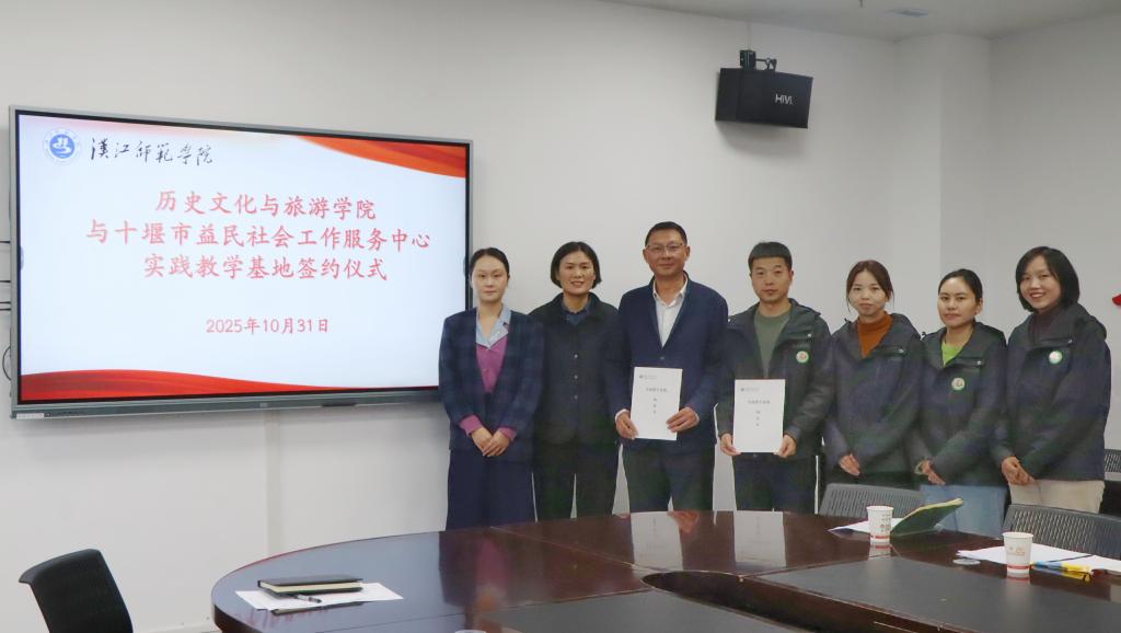 为深化产教融合,创新人才培养模式,10月31日下午,历史文化与旅游学院与十堰市益民社会工作服务中心在学院会议室举行实践教学基地签约仪式。十堰市益民社会工作服务中心王世军干事及机构骨干,文旅学院院长饶军、行政管理教研室主任董德琴、专任教师史玉琴、龚蕙子及7名学生代表共同参加。仪式由龚蕙子老师主持。