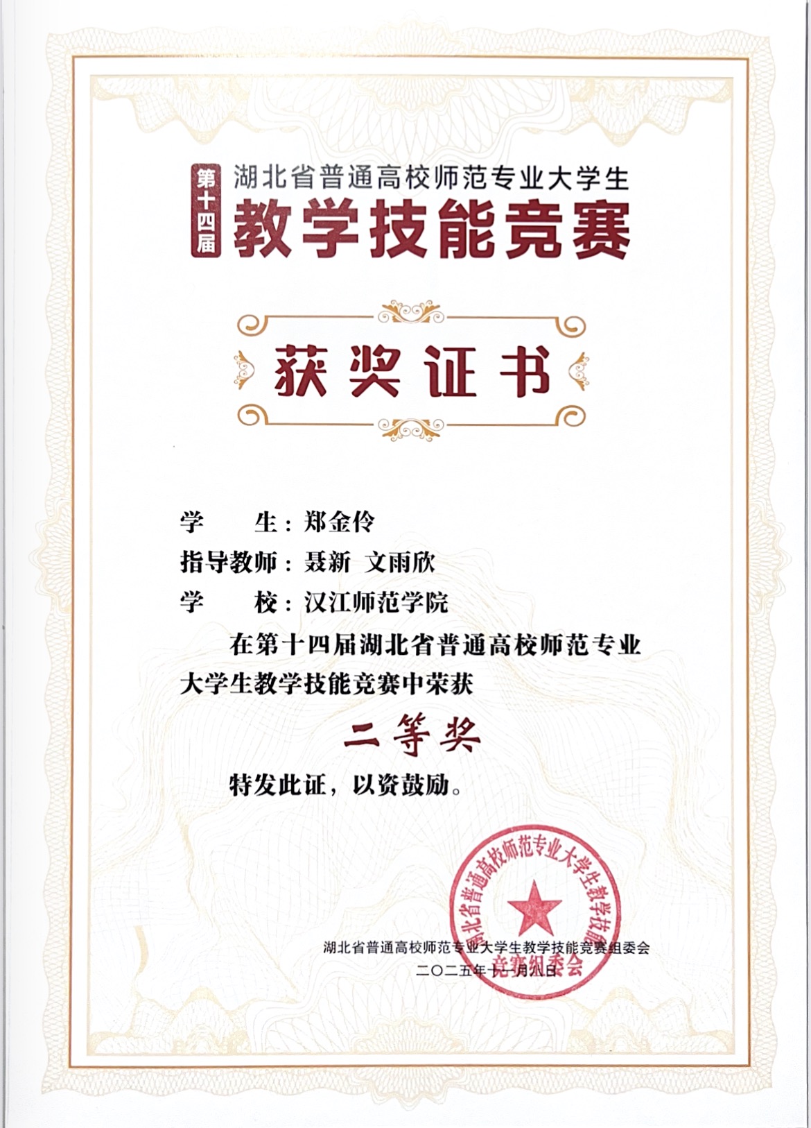11月8日,由湖北省教育厅指导、华中师范大学承办的第十四届湖北省普通高校师范专业大学生教学技能竞赛在华中师范大学圆满落下帷幕。在聂新老师、孙浩老师、文雨欣老师、十堰市郧阳中学魏楚楚老师的共同指导下,我院历史学专业的郑金伶同学,从激烈的竞争中脱颖而出,进入到现场总决赛,最终荣获二等奖的优异成绩,另一位参赛学生牛鸿莲同学在郭宁老师和十堰市东风第七中学李吉老师的指导之下,亦获得三等奖。