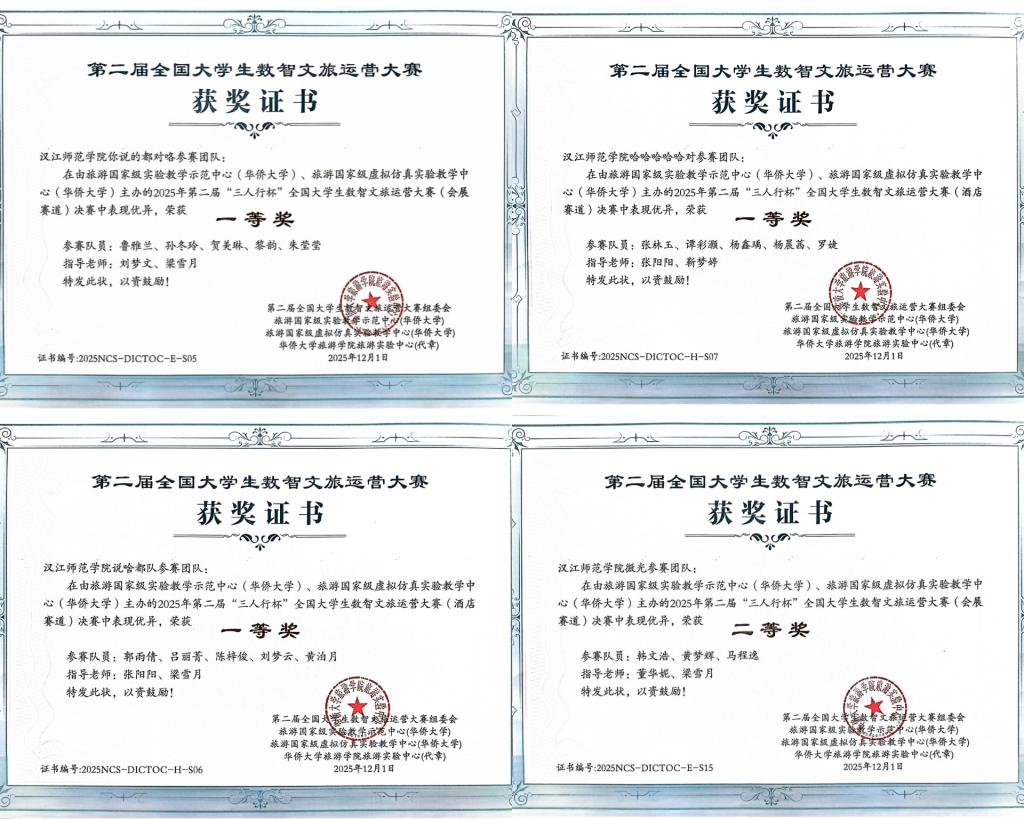 学院将以此次佳绩为新的起点,持续深化“以赛促学、以赛促教、以赛促创”的育人模式,进一步强化学生数智技术应用能力与行业实践能力的培养,激励更多学子在更广阔的舞台上挑战自我、追求卓越,为文旅行业的高质量发展贡献更多“汉师智慧”与青春力量。