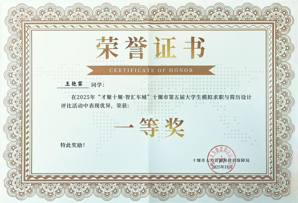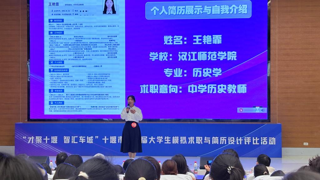 11月27日下午,由十堰市人力资源和社会保障局主办的十堰市第五届模拟求职与简历设计评比大赛在汉江师范学院图书馆学术报告厅圆满落幕,本次大赛汇聚了来自湖北医药学院、湖北汽车工业学院、汉江师范学院、湖北工业职业技术学院等多所本地高校的众多学子,最终14名选手成功跻身决赛。经过多轮激烈角逐,来自历史文化与旅游学院历史学专业的王艳霏同学,在孙浩老师的悉心指导下,凭借其出色的综合能力与稳定的现场发挥,在众多参赛选手中脱颖而出,勇夺本次大赛唯一的一等奖。
