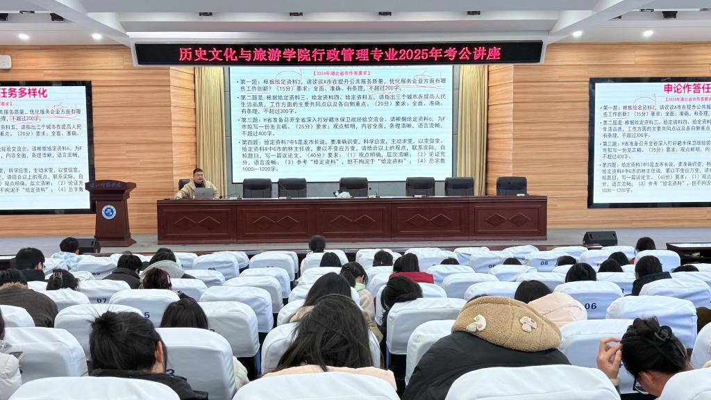 为帮助在校学生明晰职业规划、把握公职类考试机遇,提升备考效率与竞争力,12月14日上午九点半,历史文化与旅游学院在C101举办行政管理专业考公专题讲座。本次讲座特邀“格木教育”资深教师方鹏担任主讲,吸引了行政管理专业22级至25级全体学生踊跃参与。行政管理教研室主任李文君,专任教师董德琴、龚蕙子出席讲座。