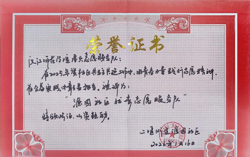 1月16日,茅箭区二堰街道源园社区召开2025年度工作总结大会,历史文化与旅游学院星火志愿服务队被授予“源园社区优秀志愿服务队”荣誉称号。学院分团委书记文雨欣应邀出席并发言。